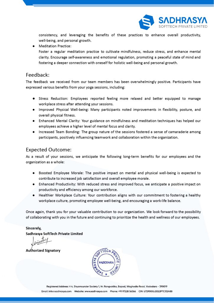 - The aim of our yoga sessions is to make employees work efficiently , happily with uplifting the employee health as well.